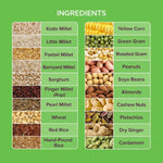 Ingredients: Kodo Millet, Little Millet, Foxtail Millet, Barnyard Millet, Sorghum, Finger Millet (Ragi), Pearl Millet, Wheat, Red Rice, Hand-Pound Rice, Yellow Corn, Green Gram, Roasted Gram, Peanuts, Soya Beans, Almonds, Cashew Nuts, Pistachios, Dry Ginger and Cardamom.