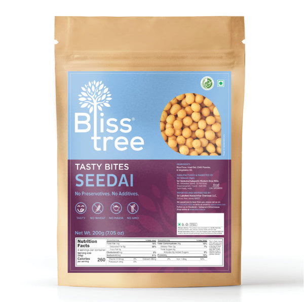 Going nuts having the same kind of snacks to munch on? Well, with Bliss Tree's Seedai you won't be disappointed. This uniquely delicious muncher, power-packed with the goodness of Rice Flour and Urad Dal, is the perfect nutrient-rich snack to keep your hunger satisfied for longer.