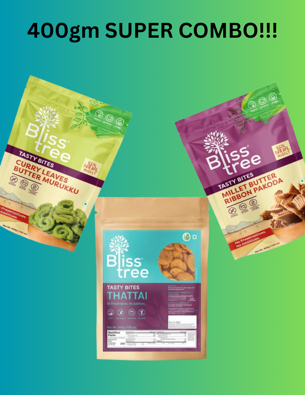 Includes 400gm Curry leaves butter murukku, 400gm Crispy Thattai  or 400 gm Millet Ribbon pakoda
